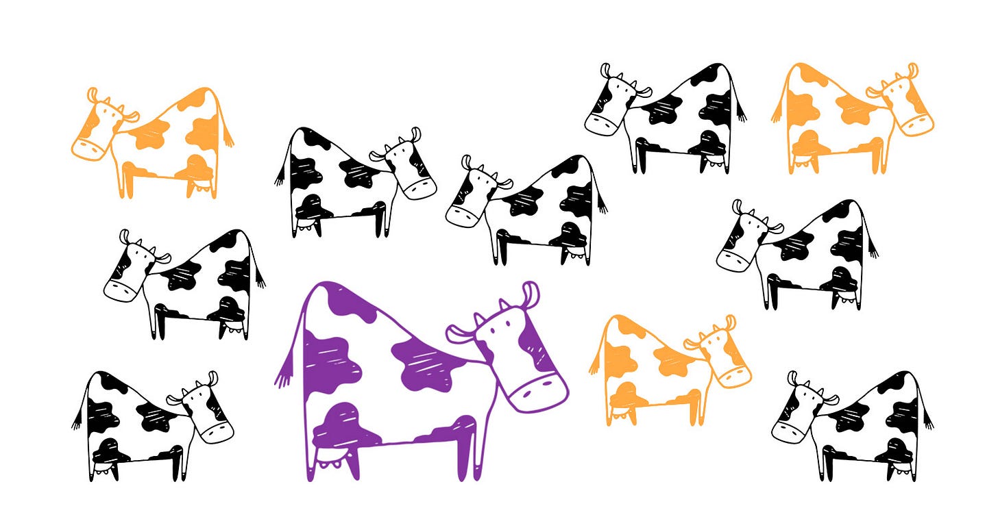 Představ si, že jedeš autem po venkově. Míjíš pastviny plné krav. Hnědé, černobílé, zase hnědé... Po chvíli si jich přestaneš všímat. Ale co kdyby mezi nimi stála jedna fialová? Tu bys nezapomněl, viď? O té bys vyprávěl všem kamarádům. Fotil by sis ji. Sdílel na Instagramu.