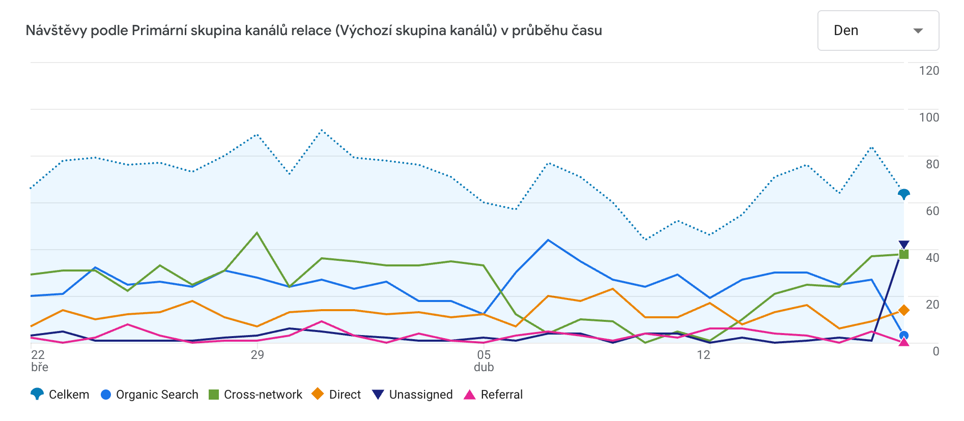 Tohle je nejčastěji přehlížená část. Najdeš kanál, ze kterého ti chodí výrazně víc lidí než z ostatních - a to je informace k zamyšlení. Přichází ti nejvíc lidí z organického vyhledávání? Pak SEO pro tebe funguje a má smysl v něm pokračovat a rozvíjet ho. Přichází hodně lidí z Referral - tedy z jiných webů? Pak má cenu zjistit, ze kterých konkrétně, a přemýšlet, jak podobných odkazů získat víc. Funguje ti e-mail? Skvělé, to je kanál, který máš plně pod kontrolou a který stojí za rozvoj.